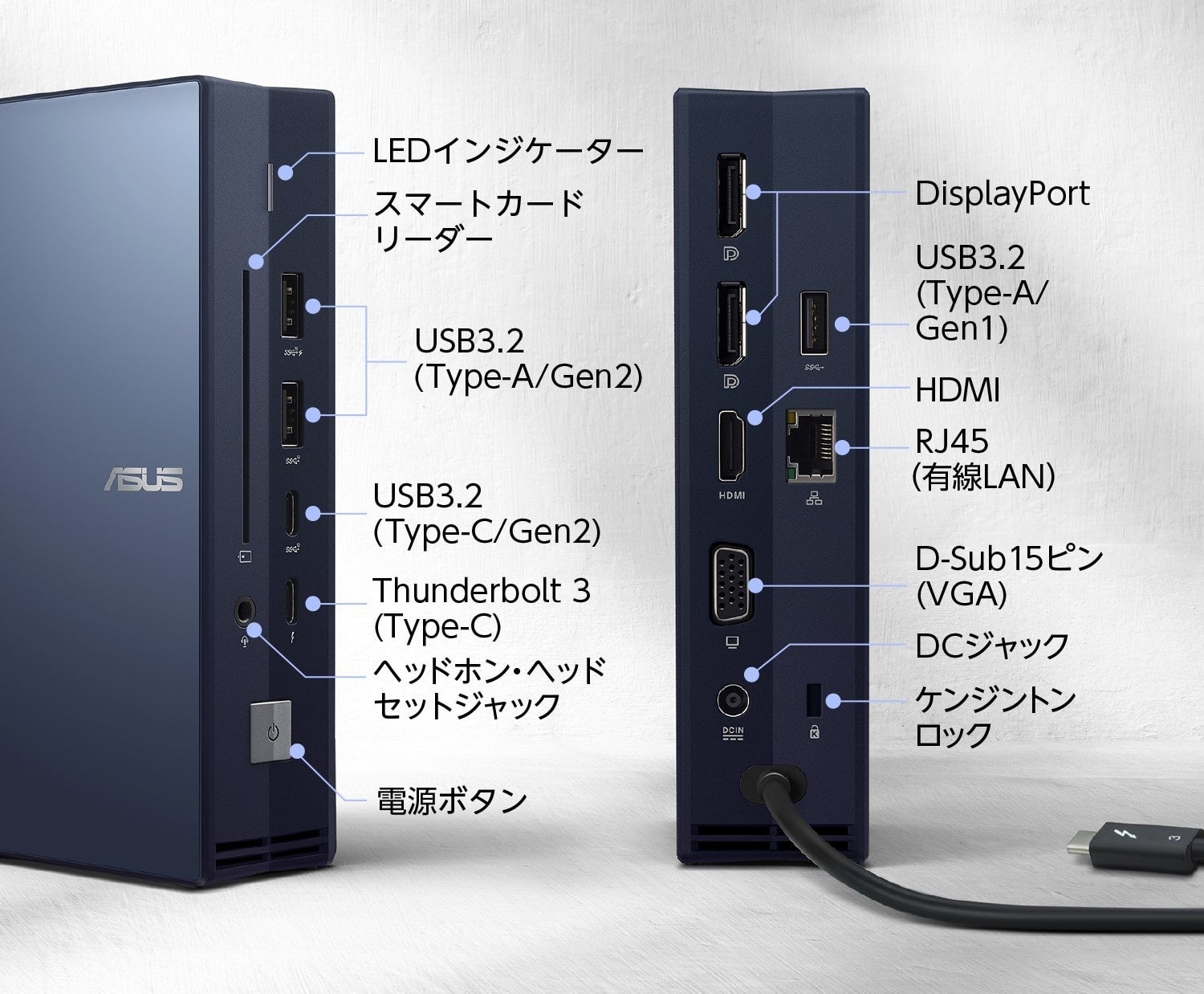 ASUS SimPro Dock 2は、ノートPCのUSB Type-Cポート経由で素早く接続できる便利な0.6mのケーブルを内蔵しており、こちらで、互換性のあるASUSの法人向けノートPCに対して最大120Wの電力を供給、かつ、充電効率を向上させます。また、ASUS SimPro Dock2 をノートPCと接続していない状態でも、接続したデバイスに対して急速充電が可能なUSBポートを搭載しています。