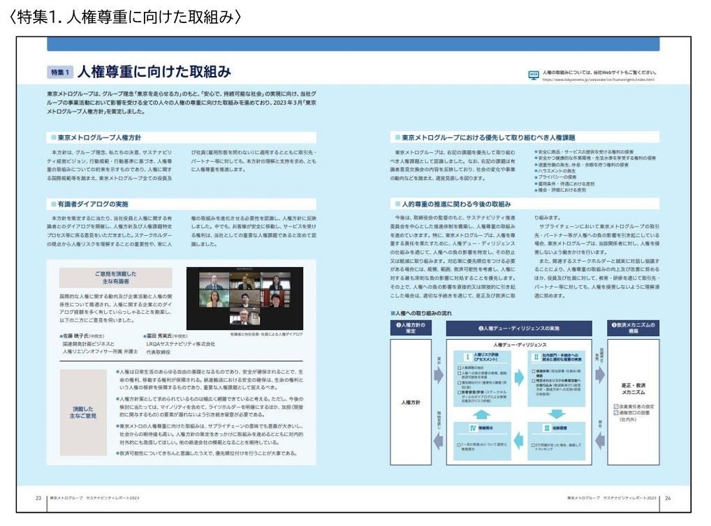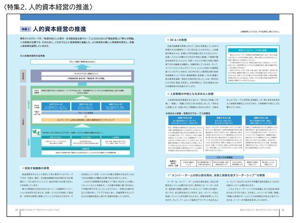 今回のレポートでは、本年3月に策定した「東京メトログループ人権方針」を中心とした人権尊重に向けた取組みや、新たに制定した「東京メトログループDE&I宣言」を含む人的資本経営の推進について紹介しています。また、脱炭素社会の実現に向けた「メトロCO2 ゼロチャレンジ 2050」の変更及び目標達成に向けた推進方針を新たに掲載しています。さらに、昨年度開始したステークホルダーエンゲージメントについても引き続き拡充して掲載しています。