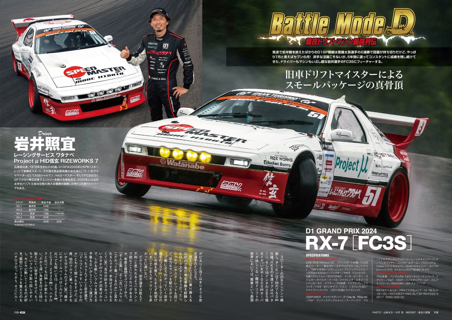 競技スペックのドリフトマシンのスペックをチェックする『Battle Mode D』。連載7回目は、5年間に渡ってコンスタントに成績を残し続けている“いぶし銀”、岩井照宜選手のFC3Sをフィーチャー!