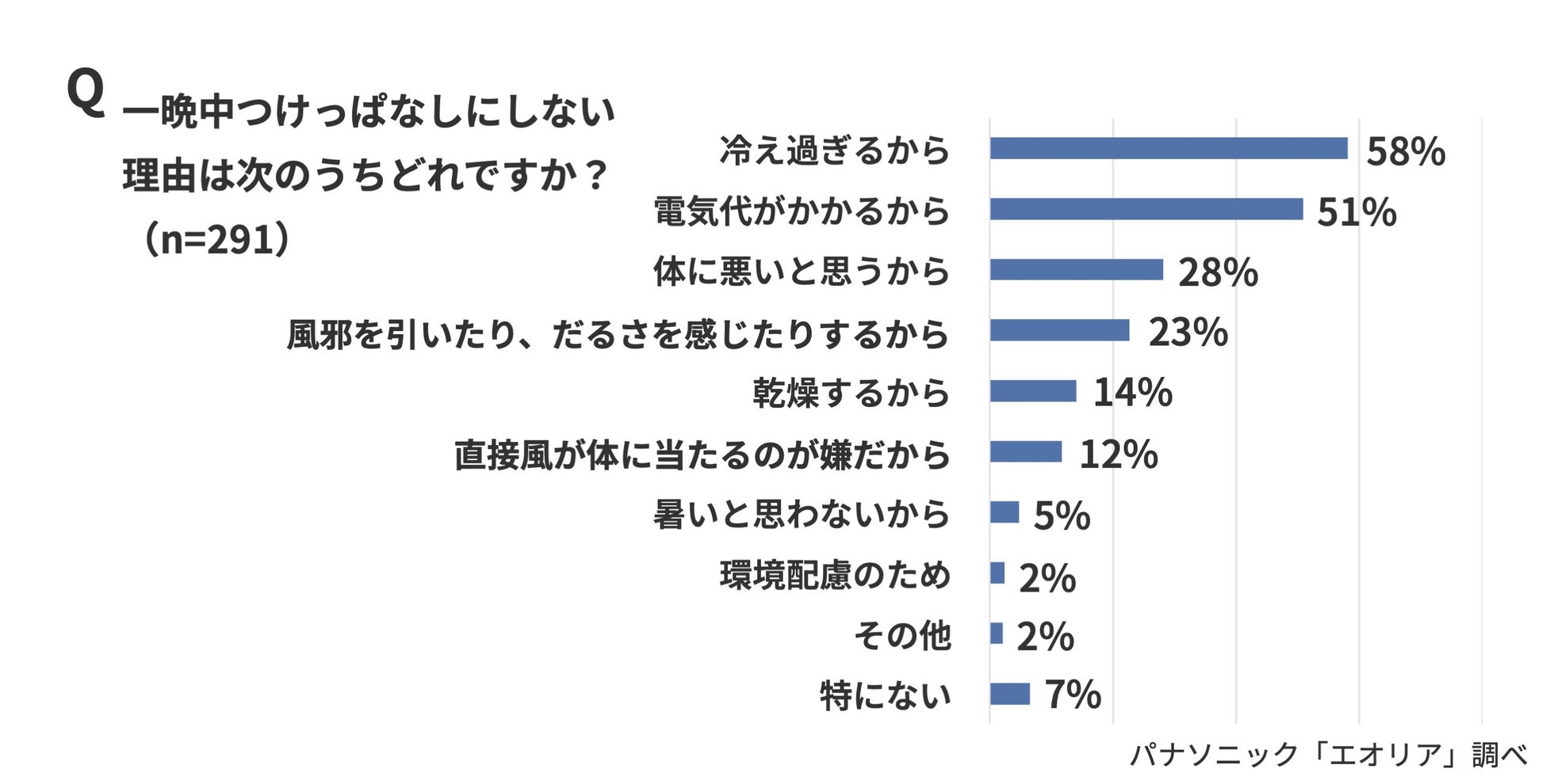 一晩中エアコンを使用しない理由としては、「冷えすぎるから」58%、「電気代がかかるから」51%、「体に悪いと思うから」28%が上位の回答になりました。
