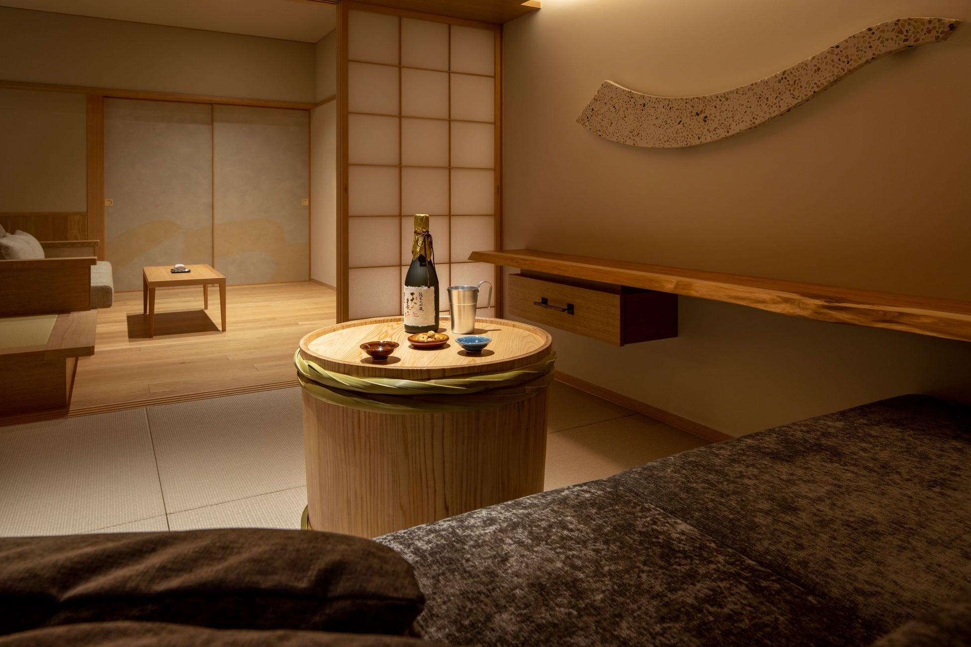 館内でも日本酒の魅力を感じられるさまざまな体験を用意しています。スタッフが選りすぐった島根の地酒を味わえる日本酒BARでは、日本酒3種とおつまみのセットを楽しめます。日本酒BARの地酒は、酒蔵の麹室をイメージしたご当地部屋「玉湯の間」で、オリジナルの酒樽テーブルを眺めながら燗酒で楽しんだり、客室露天風呂で温泉に浸かりながら桶酒で味わったりすることもできます。また、日本酒風呂や日本酒パックで内からだけでなく外からも日本酒を満喫できるのは、界 玉造ならではの体験です。