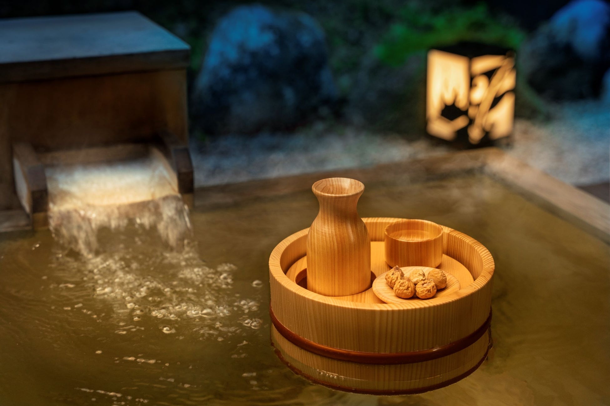 19:30 客室露天風呂で桶酒を堪能
