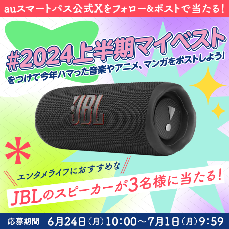 内容 | X(旧Twitter)にてハッシュタグ「#2024上半期マイベスト」をつけた上で、2024年上半期のお気に入りエンタメ作品(アニメ・マンガ・音楽)について投稿いただくキャンペーンを開催します。投稿をいただいた方の中から抽選で3名さまに、エンタメ鑑賞におすすめのJBLのスピーカーをプレゼントします。 |