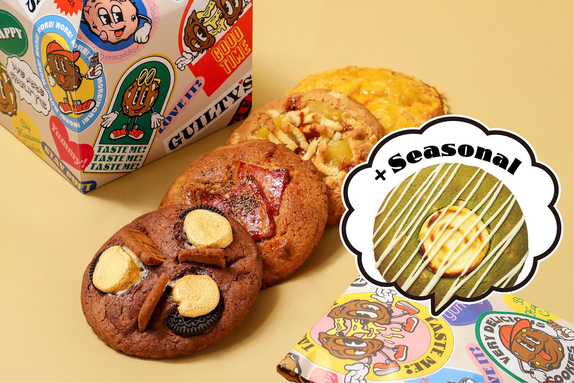 オープンにあたっては、人気フレーバー『ココアマシュマロクッキー』『キャラメルアップルクランブル』、甘じょっぱい組み合わせでご試食いただいたほとんどのお客様がご購入に至った『厚切りベーコン&じゅわっとメイプル』『ハニーベイクドフロマージュ』の定番4種が登場!また、5月から新発売する季節限定商品『抹茶ホワイトチョコクッキー』を豊田店限定で先行販売いたします。さらに、定番フレーバー4種と季節フレーバー1種を詰め合わせた、ギフトや手土産にもぴったりな『GUILTY’S オールスターズBOX』もご用意しております。