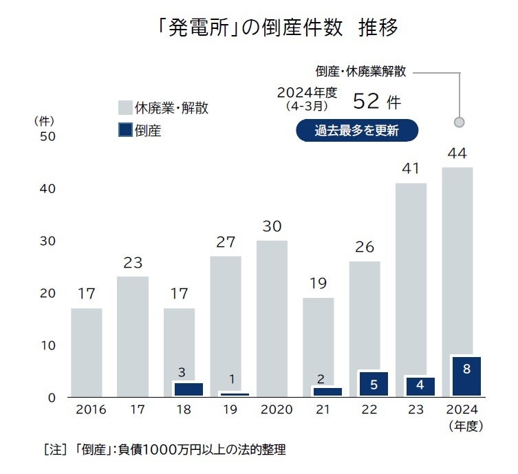再生可能エネルギーを中心とした発電事業者の倒産や廃業が相次いでいる。2024年度(2024年4月~2025年3月)に発生した、太陽光発電や木質バイオマス発電など再エネを中心とした発電事業者の倒産(負債1000万円以上、法的整理)は8件となり、前年度から倍増した。休廃業・解散(廃業)の44件を合わせると、過去最多となる52件が市場から消滅した。