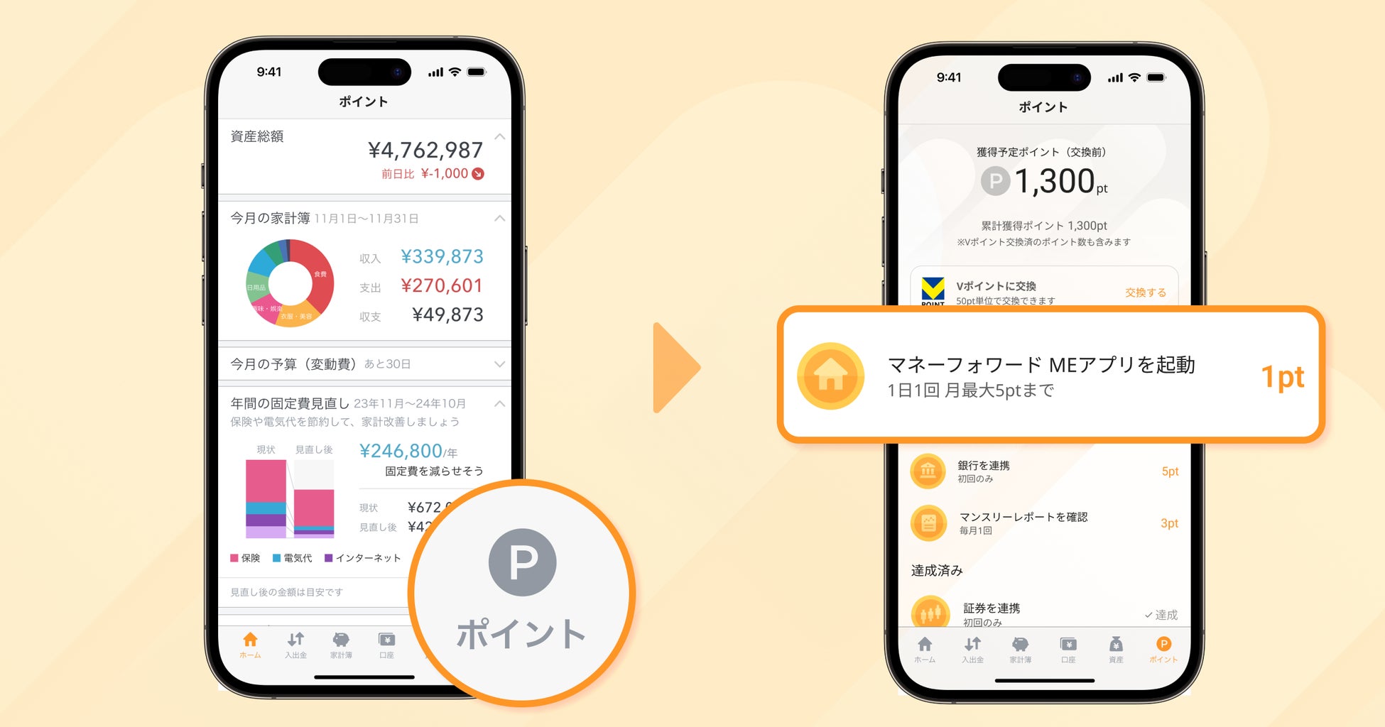 貯まった獲得予定ポイントは、『マネーフォワード ME』アプリを通してVポイントに交換できます。獲得予定ポイント1ポイント=Vポイント1ポイントとして、また、交換したVポイント1ポイントは1円分として、全国約16万店舗のVポイント提携先やVisa のタッチ決済に対応している世界の約1億店で利用できます。