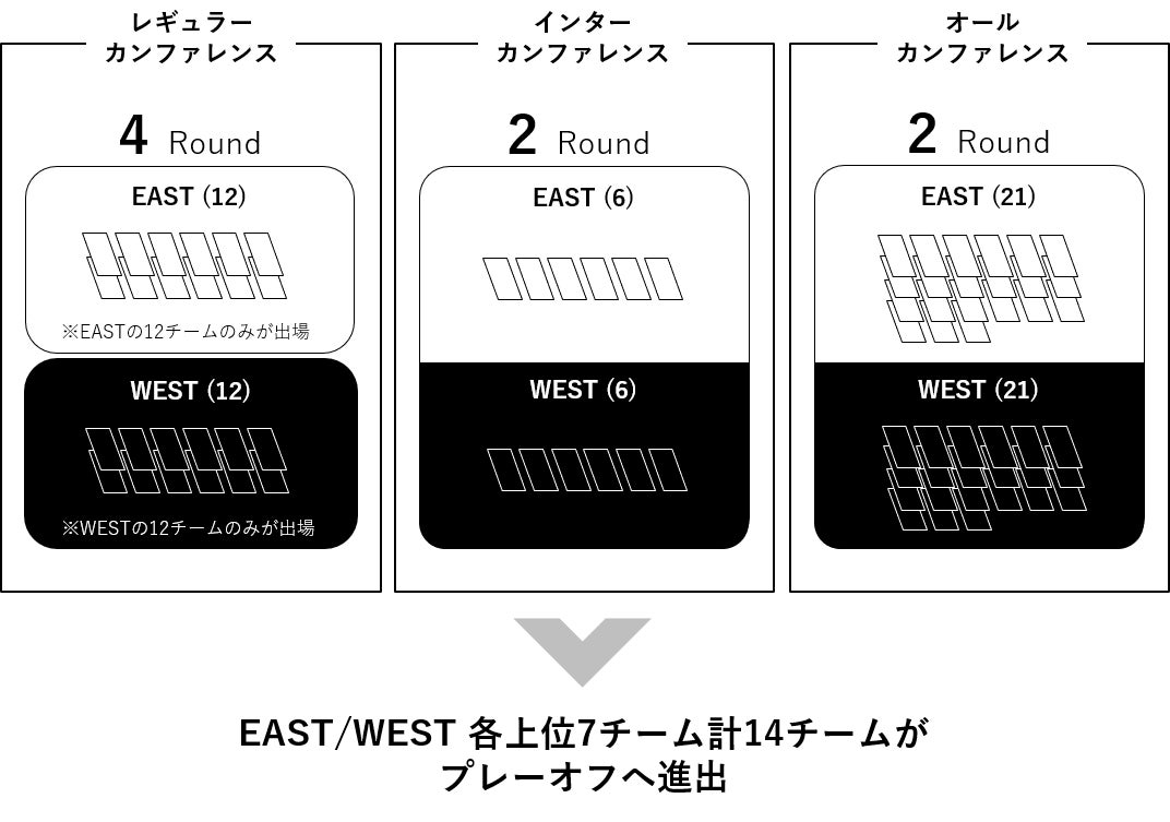 また、大会フォーマットについては、2022シーズンまでチーム本拠地を基準に6チーム毎に分けた計7カンファレンス制から東西各21チームによる2カンファレンス制に変更いたします。これにより6チーム1カンファレンス内での対戦を基本としていたこれまでのシーズンと異なり、毎ラウンドで対戦するチームの組み合わせが異なることで対戦チームの偏りが減り、これまで以上にエキサイティングな戦いが期待できます。各カンファレンスの上位7チーム(計14チーム)のみが出場権利を得るプレーオフ進出争いにも注目です。