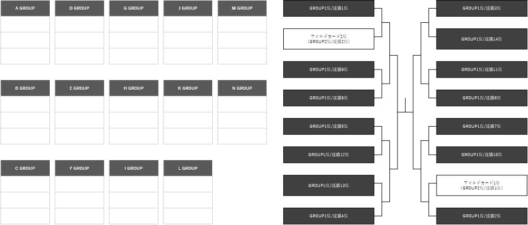 3チーム×14グループに分かれて総当たりのグループリーグ戦(DAY1)を実施し、各グループリーグの1位(14チーム)とワイルドカード(各グループリーグの成績2位チームの中から上位2チーム)の計16チームによるトーナメント戦で順位を決定する。
