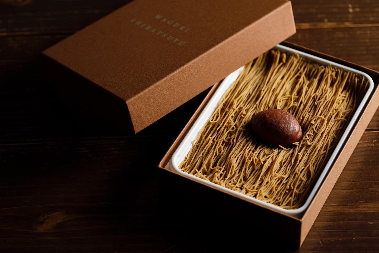 日本の四季を感じる川の流れを表現。 上の渋皮煮も厳選された大きめを使用。葛ねりと厳選和栗ペーストの新しい形モンブラン。
