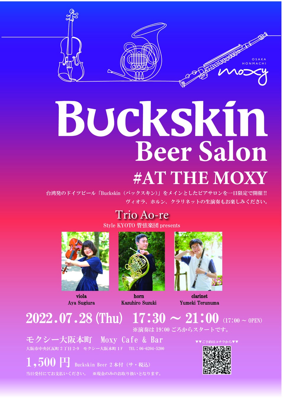 モクシー大阪本町(大阪市中央区瓦町2-2-9 / 総支配人 田口健)はこの度、株式会社日本サルベージサービスが正規代理店を務める台湾発のドイツビール「バックスキン(Buckskin:柏克金)」とStyle KYOTO管弦楽団のヴィオラ・ホルン・クラリネットによる生演奏を楽しめる『Buckskin Beer Salon #ATTHEMOXY』を2022年7月28日(木)に開催いたします。