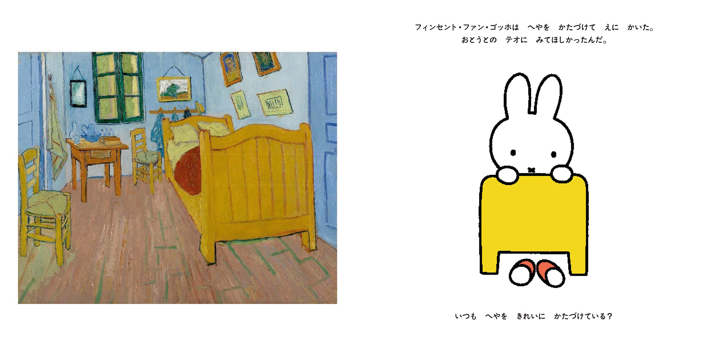 フェルメール、草間彌生、モネ、ゴッホ、マグリット、ピカソ…世界中の有名なアーティストのアート作品とミッフィーの絵を並べてじっくり見ることで、絵を見る楽しさやいろいろな発見が得られます。