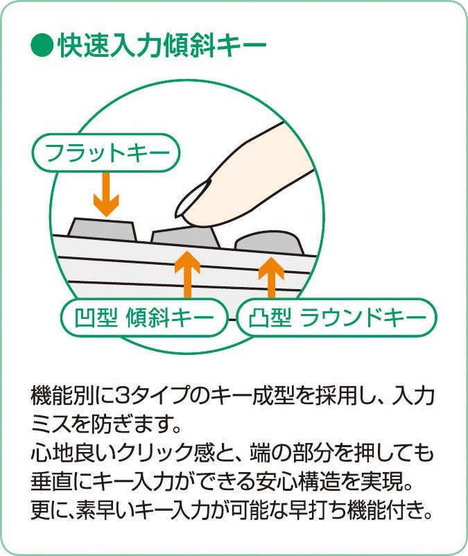・端の部分を押しても垂直にキー入力ができる快速入力傾斜キー※1を搭載し、早打ちでも打ち間違えを最小限に抑制