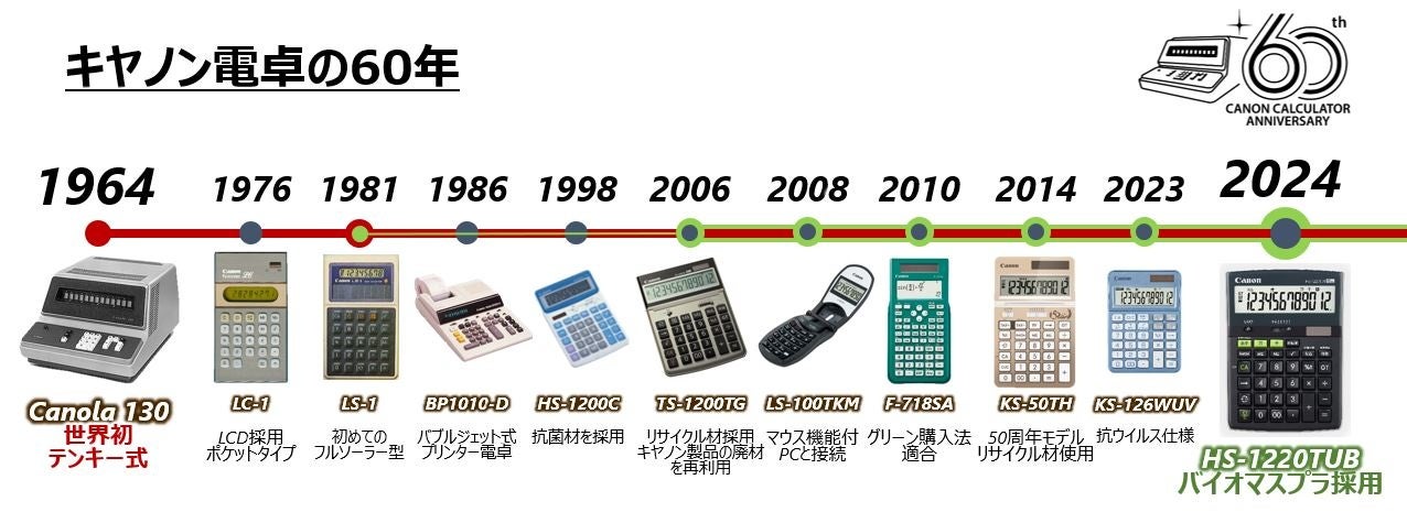 ●2024年2月 キヤノンの電卓として初めて植物由来の原料を使用し、環境に配慮した12桁卓上電卓 “HS-1220TUB”“TS-122TUB” と12桁ミニ卓上電卓“LS-122TUB”を発売。