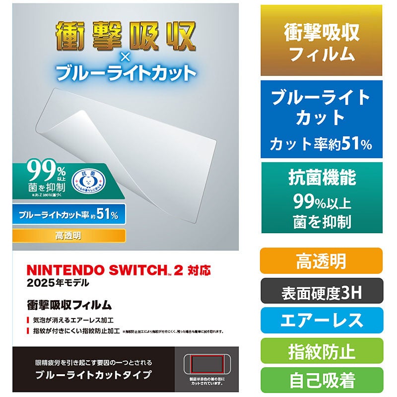 Nintendo Switch(TM) 2の画面を傷や汚れから守る、衝撃吸収タイプの画面保護フィルムです。