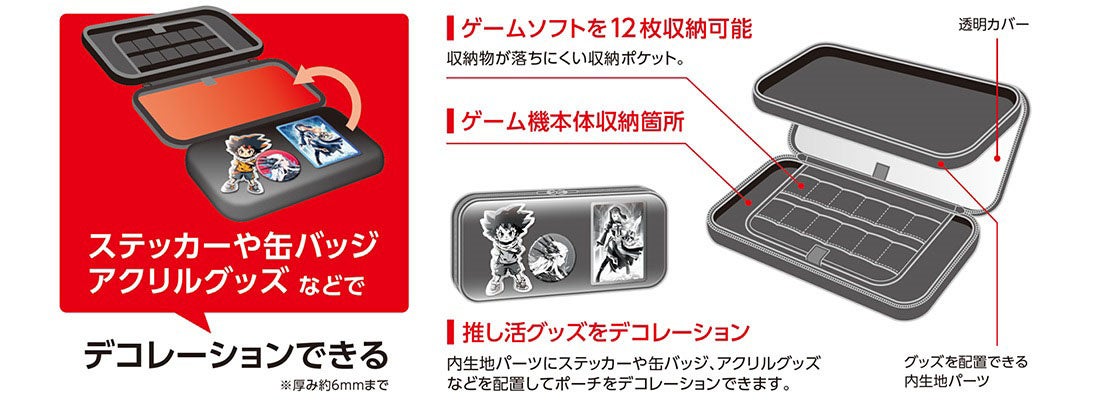本体収納ポーチは3タイプをご用意。「デコラティブハードポーチ」は、上面にクリアポケットを備え、アクリルスタンドや缶バッジなどを見せながら本体を収納できます。片手で持ち運べるハンドル付きの「大容量セミハードポーチ」は、本体やソフトに加え、ACアダプターまたはコントローラーも収納できます。「スリムハードポーチ」は、厚さ45mmで本体とソフトをすっきり収納できます。いずれも耐衝撃クッションと起毛素材を採用したセミハード仕様で、ソフトは12枚または24枚まで収納できます。