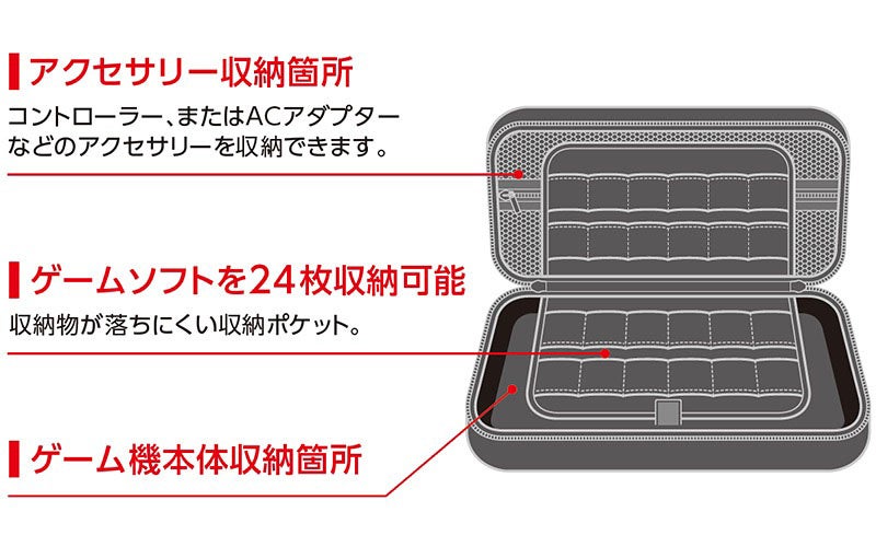 ゲーム機本体を収納できるほか、収納ポケットにはソフト12枚を収納可能です。
