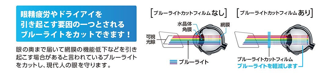 ブルーライトを効率的にカットするだけでなく、色調をできるだけ変えずに自然に見えるようなクリアタイプのフィルムを採用しています。