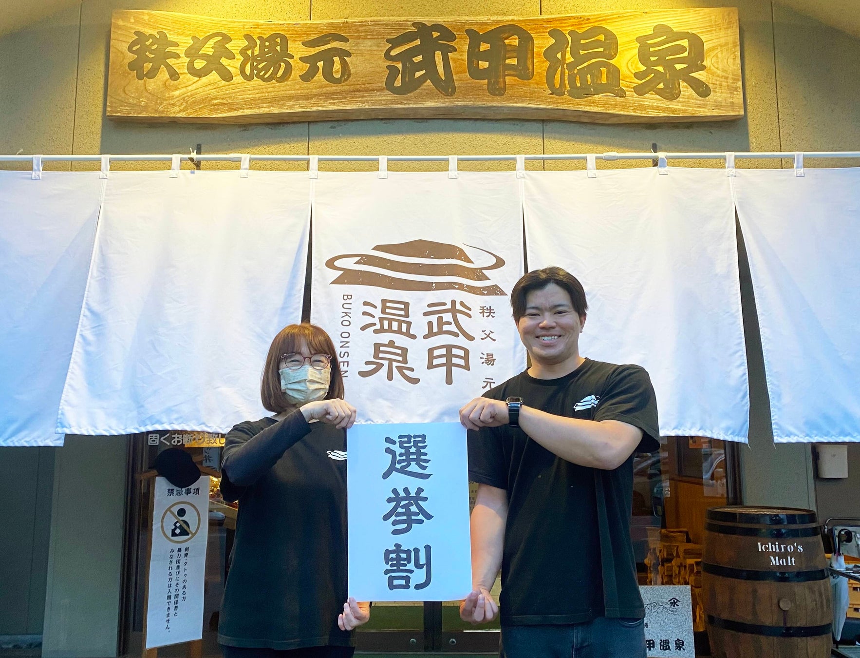 投票時に「投票済証」をもらい、対象期間中に武甲温泉へ持参すると、入館料が割引になるというサービスです。「おふろから文化を発信する」を企業理念に掲げる温泉道場では、この選挙割を行うことで、特に若い方たちに日本の政治・経済・社会の動向への関心を高めていただきたいと考えています。