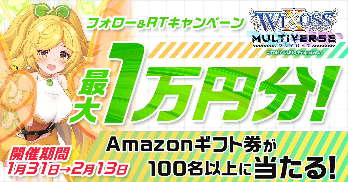 CTW株式会社は、ゲームサービス「G123」で事前登録受付中のHTML5ゲーム『ウィクロスマルチバース』の公式Twitterにて、Amazonギフト券最大10,000円分が抽選で100名以上に当たるフォロー&RTキャンペーンを開始することをお知らせいたします。