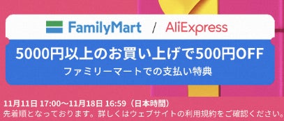 実施内容:「AliExpress」にて税込5,000円以上ご購入のうえ、「コンビニ払い」のファミリーマートを選択したお客さまを対象に、先着11,000名さまを500円値引きいたします。