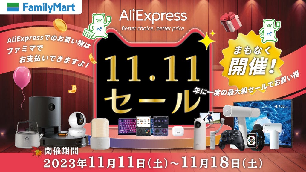 またAliExpressサイト内では2023年11月11日(土)17時よりコンビニ払いを選択すると先着11,000名さまが500円引きになるキャンペーンを実施いたします。
