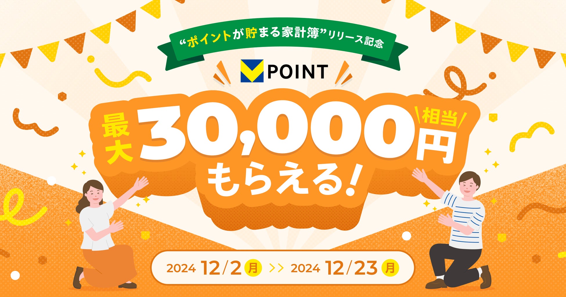 『マネーフォワード ME』、新機能「ポイントが貯まる家計簿」のリリースを記念し、Vポイントが最大30,000円相当もらえるキャンペーンを2024年12月2日(月)より開始