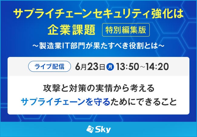 Sky株式会社は、2025年6月23日(月)に開催される、ITmedia エンタープライズ主催のライブ配信セミナーイベント「サプライチェーンセキュリティ強化は企業課題~製造業IT部門が果たすべき役割とは~特別編集版」に協賛いたします。