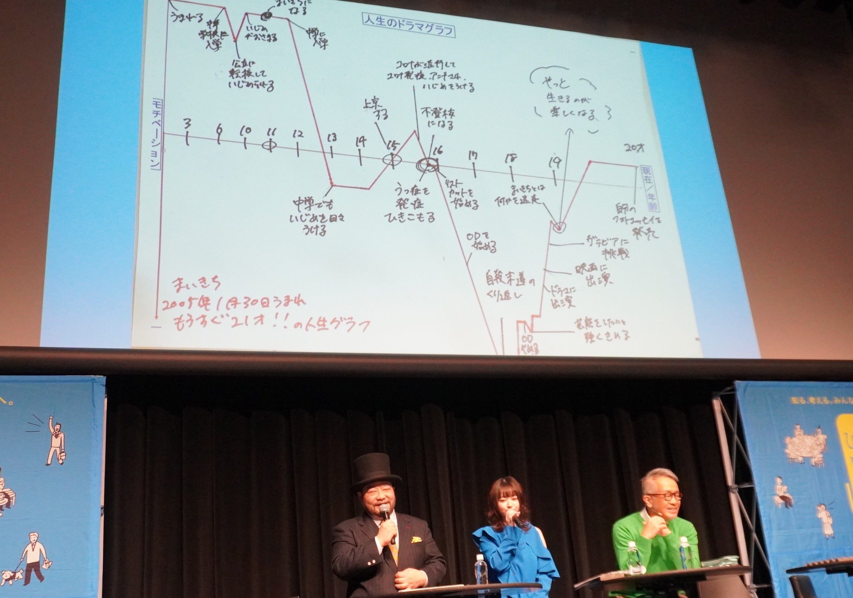 イベントは今年度の「ひきこもりVOICE STATION」の集大成として、自身もひきこもり経験のある演出家の宮本亞門さんが、ファシリテーターを務めました。ひきこもり経験のあるお笑い芸人山田ルイ53世さんとインフルエンサーまいきちさんとともに、自身の過去の感情の浮き沈みを表現する「人生ドラマグラフ」でそれぞれの当時の思いを振り返りました。ひきこもり経験を基にしたアートを紹介するバーチャル!「‟HIKIKOMORI”ANYONE?他人事じゃないかも展」で印象に残った作品の感想なども伝え合い、多様な思いを抱える人たちの存在を知るきっかけを作りました。