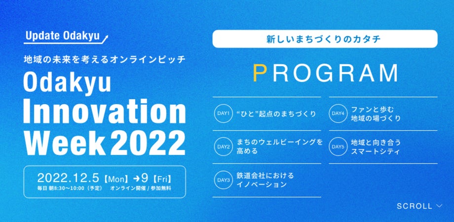 小田急電鉄株式会社(住所:東京都新宿区 社長:星野 晃司)は、2022年12月5日(月)から9日(金)の5日間、経営ビジョンに掲げる「地域価値創造型企業」の実現にむけた取り組みを発信するオンラインピッチ「Odakyu Innovation Week 2022」を開催します。
