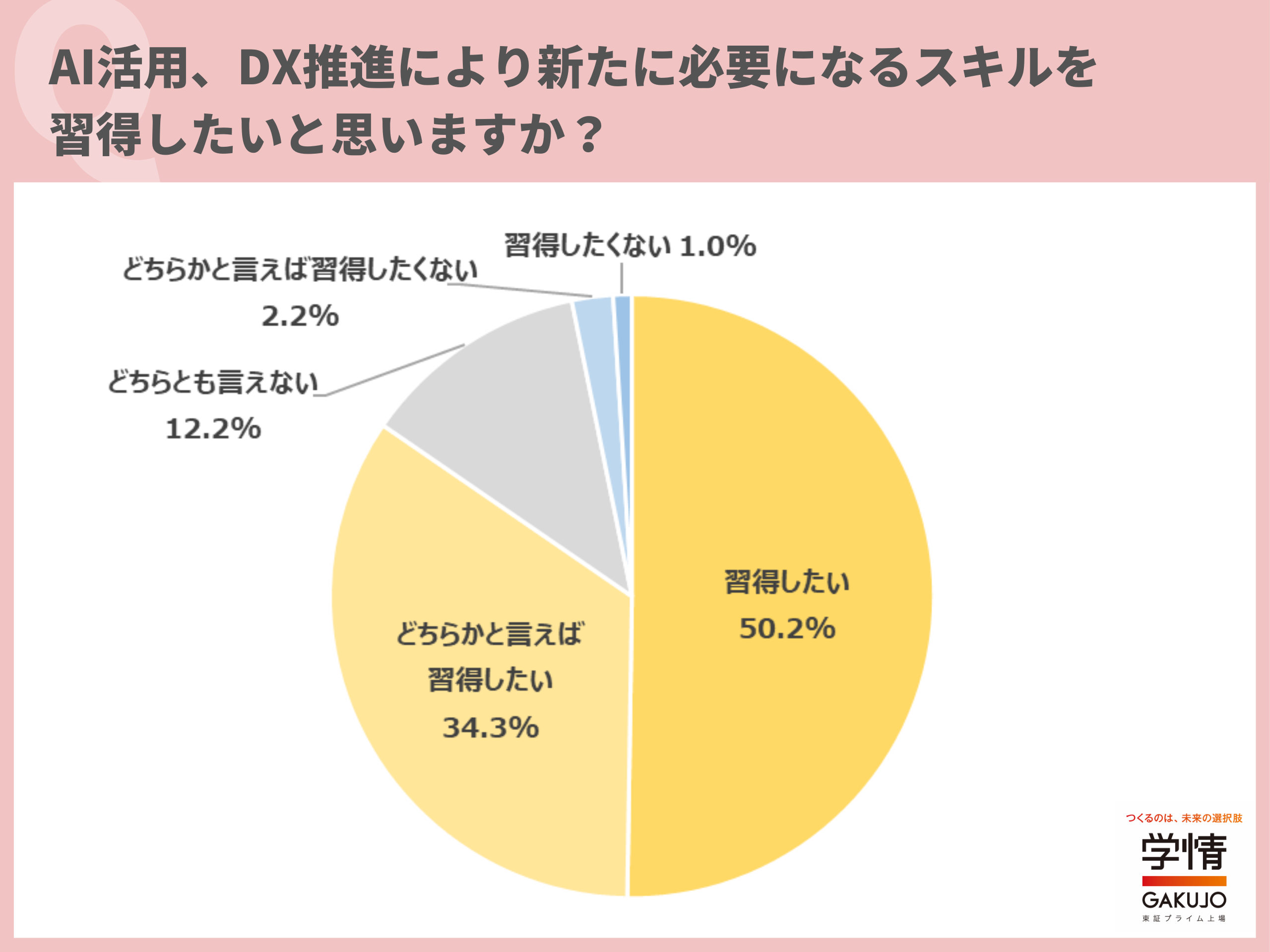 AI活用・DX推進で新たに必要になるスキルを「習得したい」と回答した20代が50.2%に上りました。「どちらかと言えば習得したい」34.3%を合わせると、8割以上の20代がAI・DX関連スキルの習得を希望していることが分かります。「キャリアの幅が広がり、転職もしやすくなると思う」「時代の変化に応じて必要とされる知識を身に付けたい」「AIやDXでできることを理解しておきたい」といった声が寄せられました。