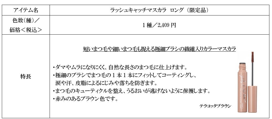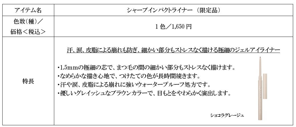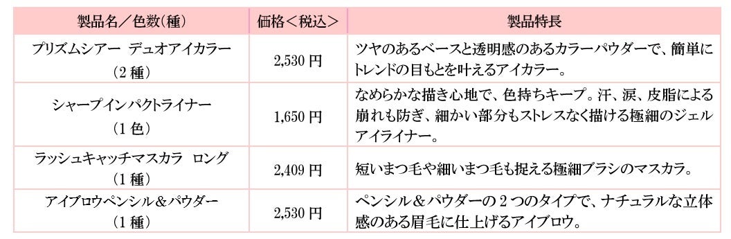 画像左から、アイブロウペンシル&パウダー、シャープインパクトライナー、プリズムシアー デュオアイカラー、ラッシュキャッチマスカラ ロング