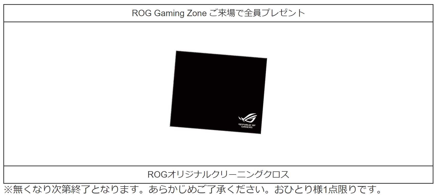 イベント期間中にビックカメララゾーナ川崎店 「ROG Gaming Zone」にご来場いただいたすべての方に対し、ROGロゴがプリントされた、オリジナル「ROGオリジナルクリーニングクロス」をプレゼント!!
