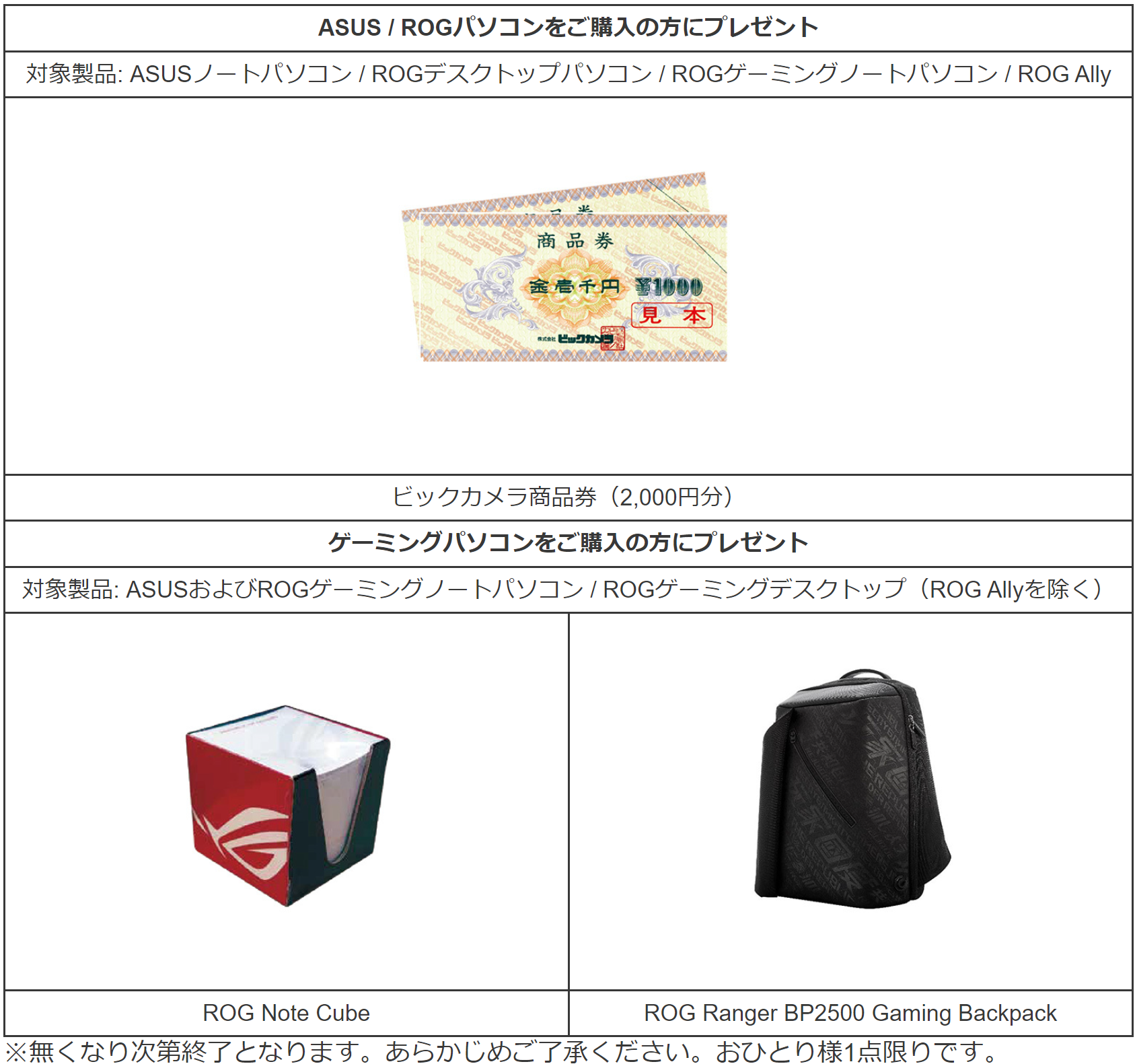 キャンペーン期間中、ビックカメララゾーナ川崎店「ROG Gaming Zone」にて、対象のASUSパソコンおよびROGゲーミングパソコン(ノートパソコン、デスクトップパソコン)をご購入のお客様に対し、先着順で、ビックカメラ商品券2,000円分をプレゼント!!さらに、ゲーミングパソコンをご購入の方には商品券に加えて、特別にデザインされたROGブロックメモ帳「ROG Note Cube」と15.6インチまでのノートパソコンを収納できる容量約17Lの大容量バックパック「ROG Ranger BP2500 Gaming Backpack」をプレゼント!!