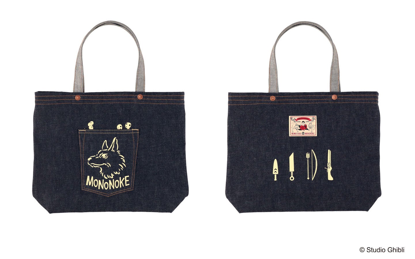 見えない部分のデザインが粋なデニムジャケットとは対照的に、「GBL×桃太郎ジーンズ もののけ姫 デニムトートバッグ」では、前面ポケットに山犬の凛々しいイラストと、ポケット上部から顔をのぞかせているようなコダマがデザインされています。背面には作品に登場する武器が描かれ、その印象的なデザインは思わず作品を見返したくなってしまいそう。