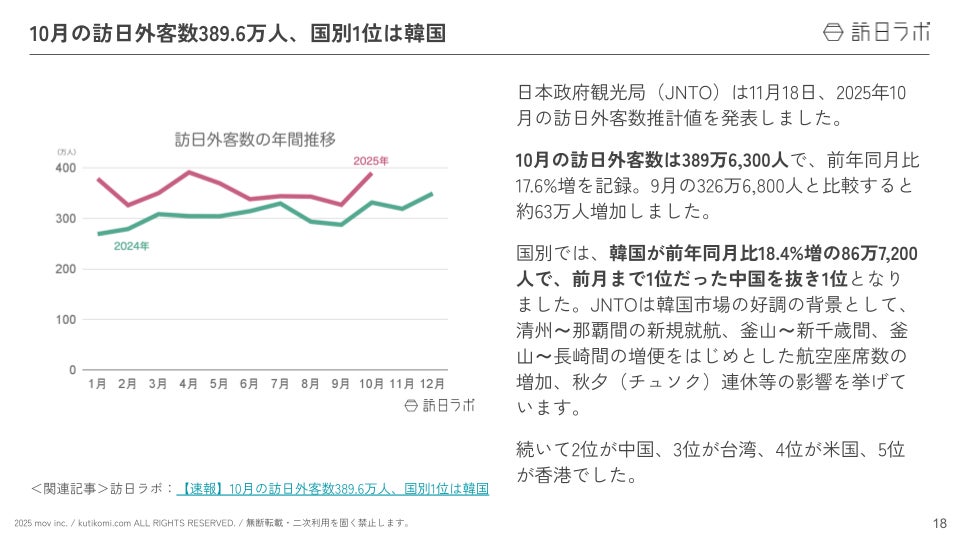 業界最大級のインバウンドビジネスメディア「訪日ラボ」及び 店舗向け集客一元化プラットフォーム「口コミコム」を運営する株式会社mov(代表取締役:渡邊 誠、本社:東京都渋谷区、以下mov)は、「インバウンドに関する最新トレンド・データ」「政府・自治体・企業などのインバウンド関連の取り組み」をはじめ、インバウンド対策に役立つニュースをまとめた「インバウンド情報まとめ【2025年11月後編】」を公開しました。