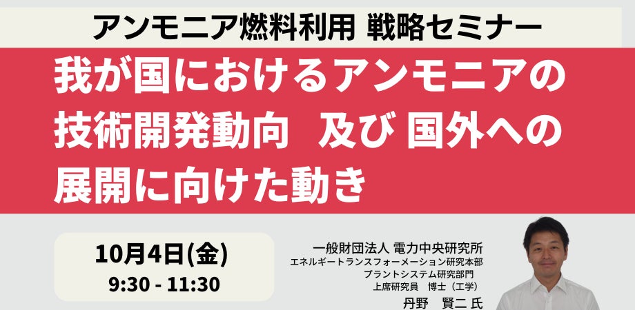 JPI(日本計画研究所)は、一般財団法人 電力中央研究所 エネルギートランスフォーメーション研究本部 プラントシステム研究部門 上席研究員 博士(工学) 丹野 賢二 氏を招聘し、アンモニアの技術開発動向について詳説いただくセミナーを開催します。