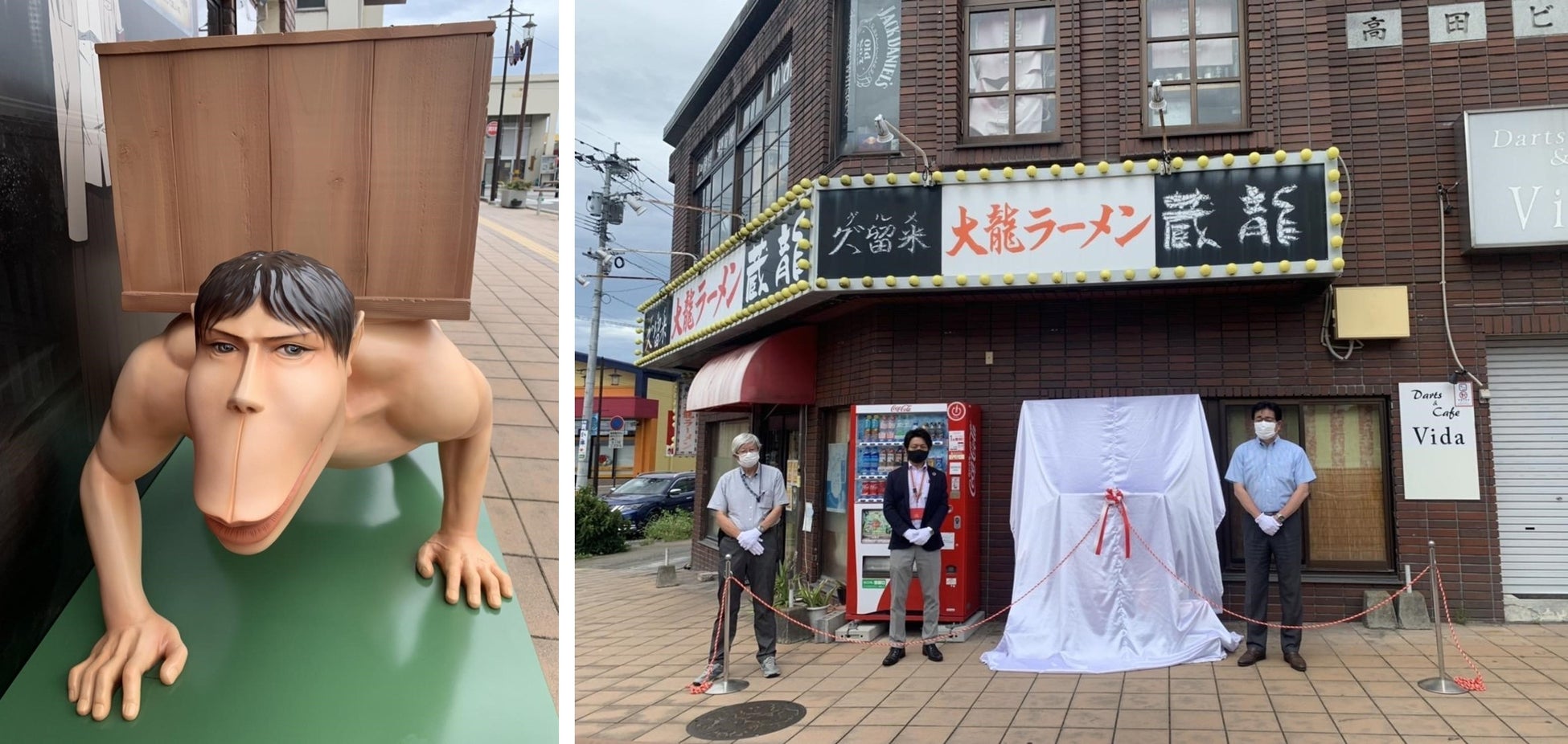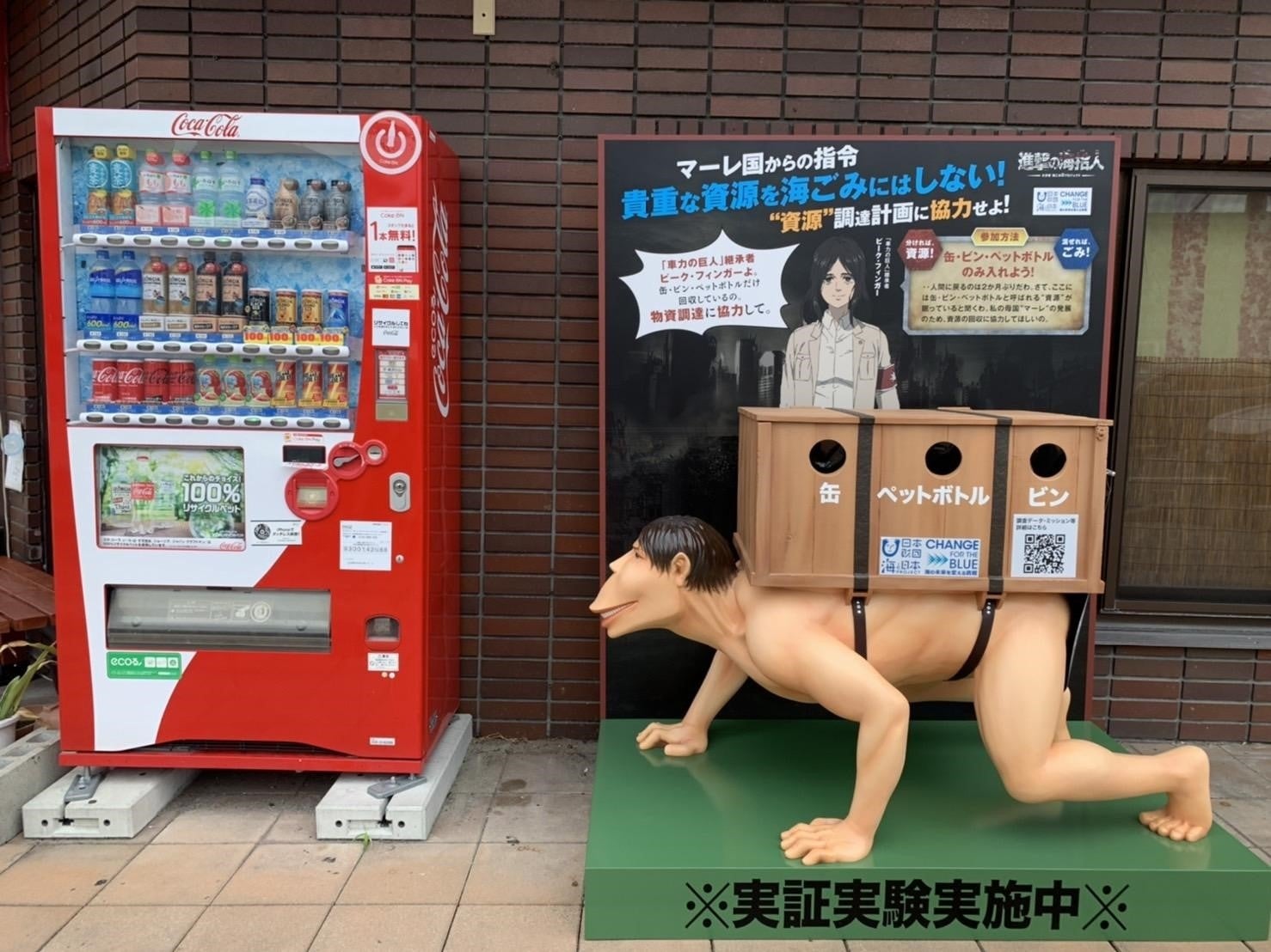 CHANGE FOR THE BLUE in 大分実行委員会は、コカ·コーラ ボトラーズジャパン株式会社と連携し、TVアニメ『進撃の巨人』に登場する「車力の巨人」を模った自動販売機専用空容器回収リサイクルボックス(以下、リサイクルBOX)を、日田駅そば・大龍ラーメン 蔵龍前のコカ·コーラ社自動販売機横に設置しました。取り組みを記念し、同日11時より、大龍ラーメン 蔵龍前にて完成披露除幕式を行いました。日頃リサイクルBOXの存在を意識しない方々にも目を向けてもらい、正しい利用を通じてOXへの異物混入状況の改善を図りました。「車力の巨人型リサイクルBOX」の設置は、昨年度より推進しているTVアニメ『進撃の巨人 The Final Season』とのタイアッププロジェクト「進撃の海拾人(かいしゅうにん)」の今期第3弾として実施されています。リサイクルBOXは、2022年11月28日(月)まで設置予定です。
