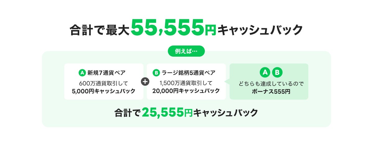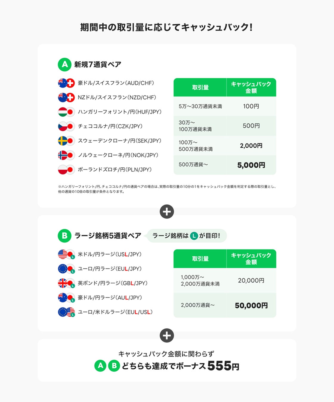 新規通貨ペアとラージ銘柄の取引どちらも達成で最大55,555円をキャッシュバックします。