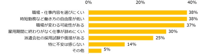 無期雇用派遣のメリットを挙げ、魅力に感じる点を伺うと、トップは「3年を超えても同じ職場で同じ業務ができる」「雇用期間に終わりがなく安定して働ける」(同率60%)でした。またデメリットを挙げて不安や心配を感じる点を伺うと、トップは「職場・仕事内容を選びにくい」「時短勤務など働き方の自由度が低い」(同率38%)でした。