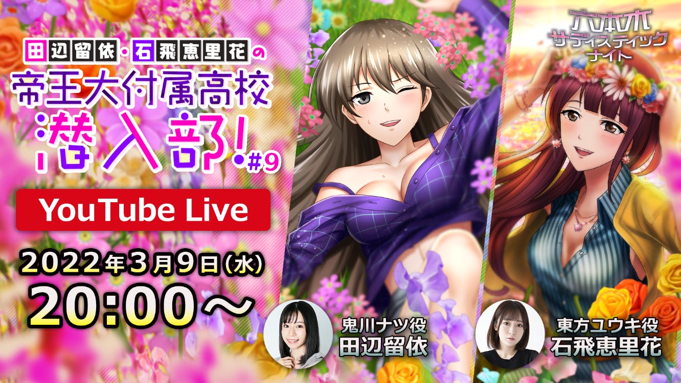 2022年1月よりレギュラー配信を開始し、ご好評いただいているYouTube番組「田辺留依・石飛恵里花の帝王大付属高校潜入部!」の生配信を3月9日(水)に実施いたします。