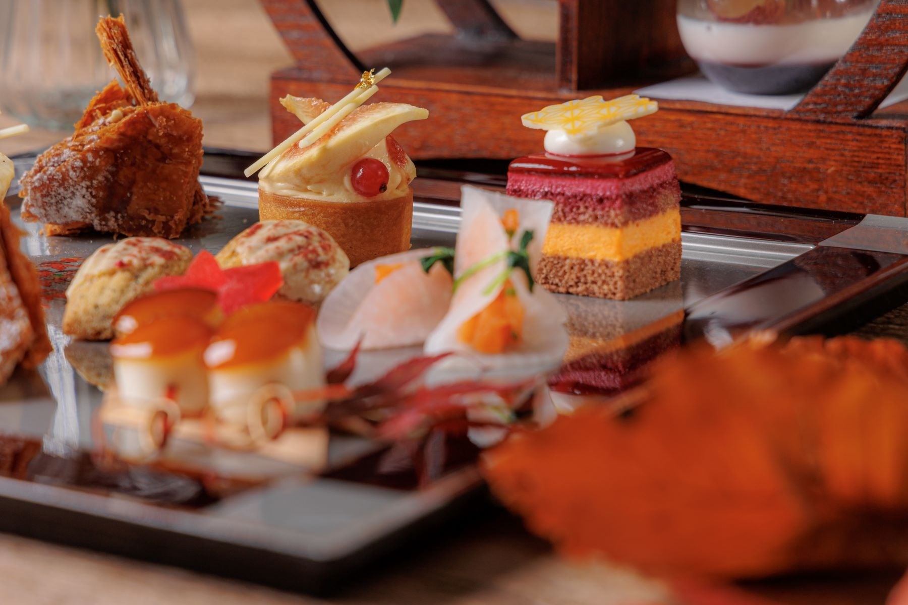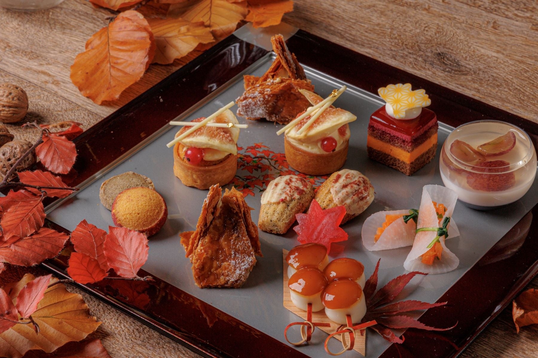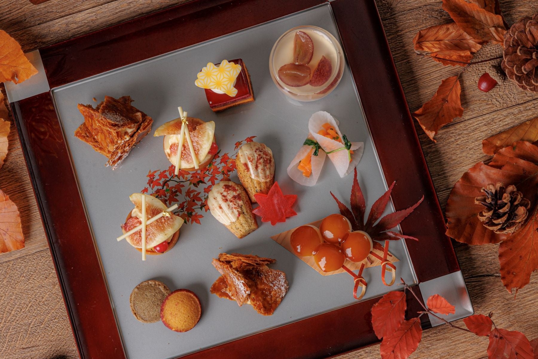 和と洋を取り入れたスイーツ8種には、旬のりんごとキャラメルのミルフィーユや上品なアールグレイのマドレーヌ、カシスとオレンジが層になった秋らしい色合いのムースケーキ、ほうじ茶風味のアーモンド生地にカスタードとフレッシュ無花果をのせたタルト、黒ごまのサブレと、紫芋のパウダーを付けたさつまいものサブレ、みたらし団子、ぶどうのジュレ・パンナコッタの層に巨峰と白ワインのジュレをのせたグラスデザートをご用意。