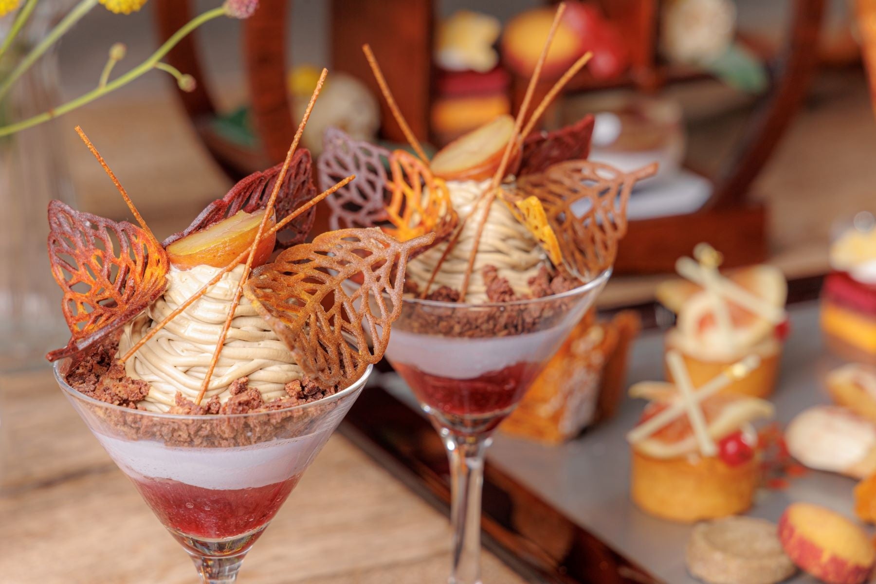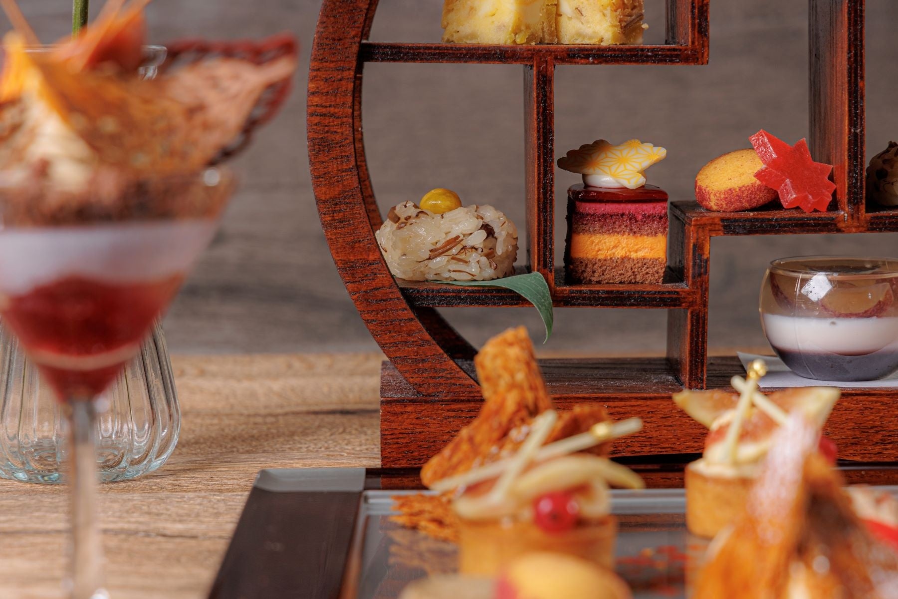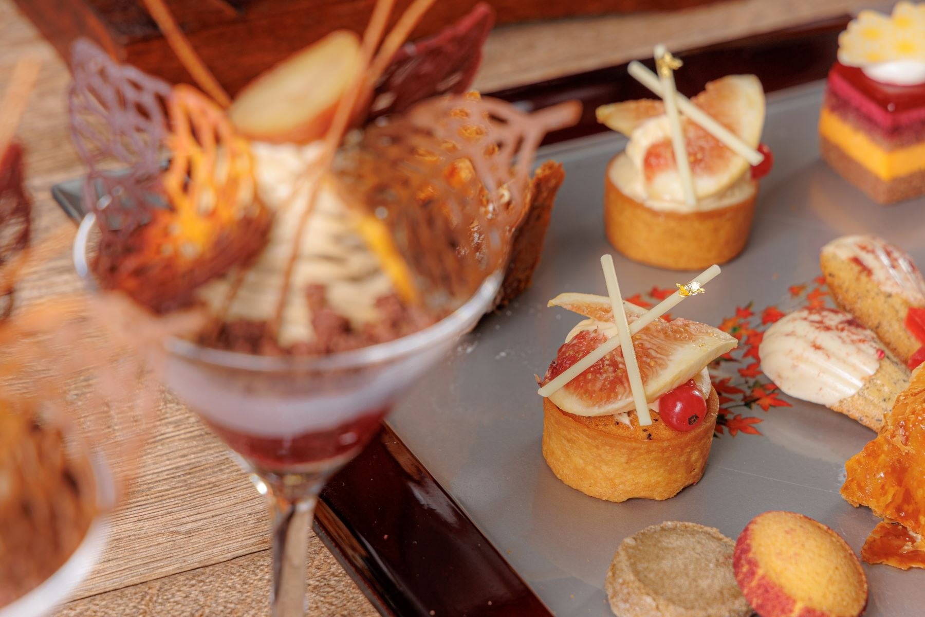 和と洋を取り入れたスイーツ8種には、旬のりんごとキャラメルのミルフィーユや上品なアールグレイのマドレーヌ、カシスとオレンジが層になった秋らしい色合いのムースケーキ、ほうじ茶風味のアーモンド生地にカスタードとフレッシュ無花果をのせたタルト、黒ごまのサブレと、紫芋のパウダーを付けたさつまいものサブレ、みたらし団子、ぶどうのジュレ・パンナコッタの層に巨峰と白ワインのジュレをのせたグラスデザートをご用意。