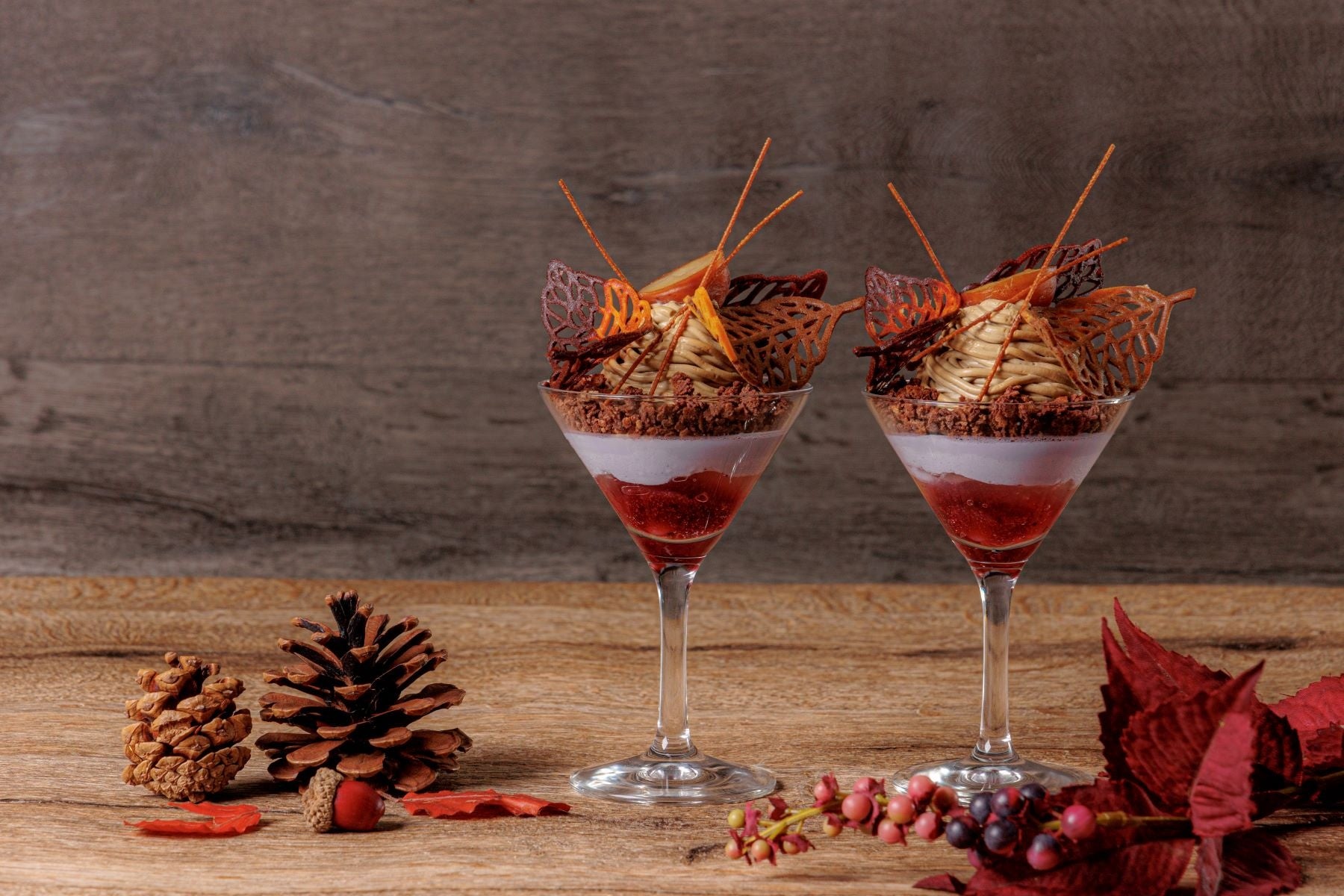 美しい紅葉をイメージした「カシスと和栗のモンブランパフェ」は、グロゼイユ(赤すぐり)・バニラのジュレ・カシスムースチョココーティングのフィアンティーヌの3層のベースに、モンブランクリーム、栗の渋皮煮、紅葉に見立てた葉っぱのチュイールで飾りを施した食べるのを躊躇ってしまうほどの繊細で美しい仕上げに。
