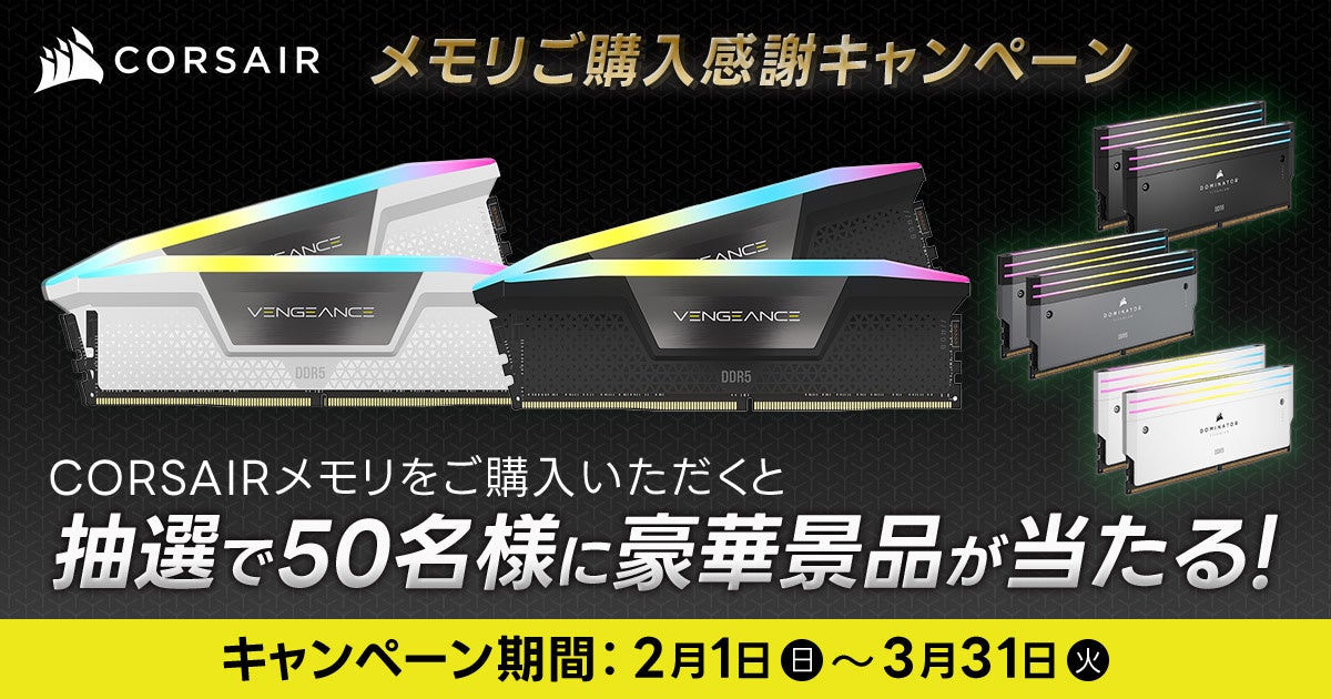 株式会社アスク(本社:東京都千代田区)は、2026年2月1日(日)~3月31日(火)の期間、CORSAIR社と共同で、同社製メモリをご購入いただいた方を対象に、抽選で豪華景品が当たるキャンペーンを実施いたします。