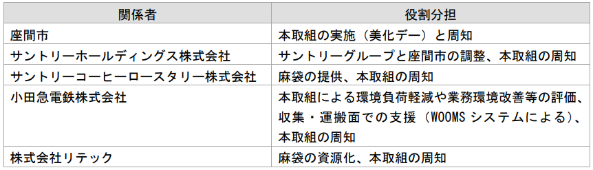 本施策において当社は、アイデアの提供や具体化に向けた座間市やパートナー企業との連携、麻袋の効率的な回収システムの提供と、恒常化に向けた評価・検証などコンサルティング領域の役割を担い、地域の資源循環を促進する新たなチャレンジと位置づけています。