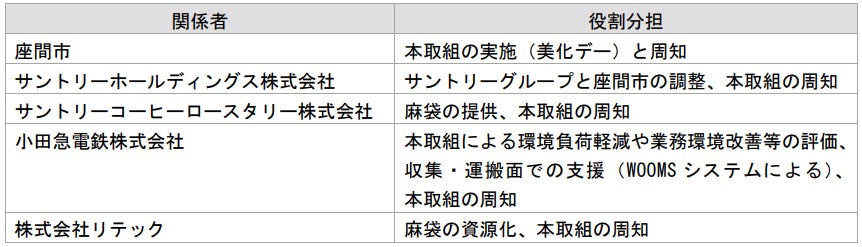 麻袋は、サントリーコーヒーロースタリー株式会社の海老名工場から排出される事業系廃棄物の一部を座間市が無償で譲り受けます。これを座間市内一斉清掃活動「美化デー」が実施される11月6日までに市民へ配布のうえ、美化デー当日に剪定枝排出用袋としてリユースします。11月7日から一週間かけて「WOOMS」システムを活用した効率的な収集方法によって、剪定枝を回収することで、これまで焼却していた麻袋の削減によるCO2排出量の低減とともに、収集した袋と中身を分別する作業の効率化を実現します。