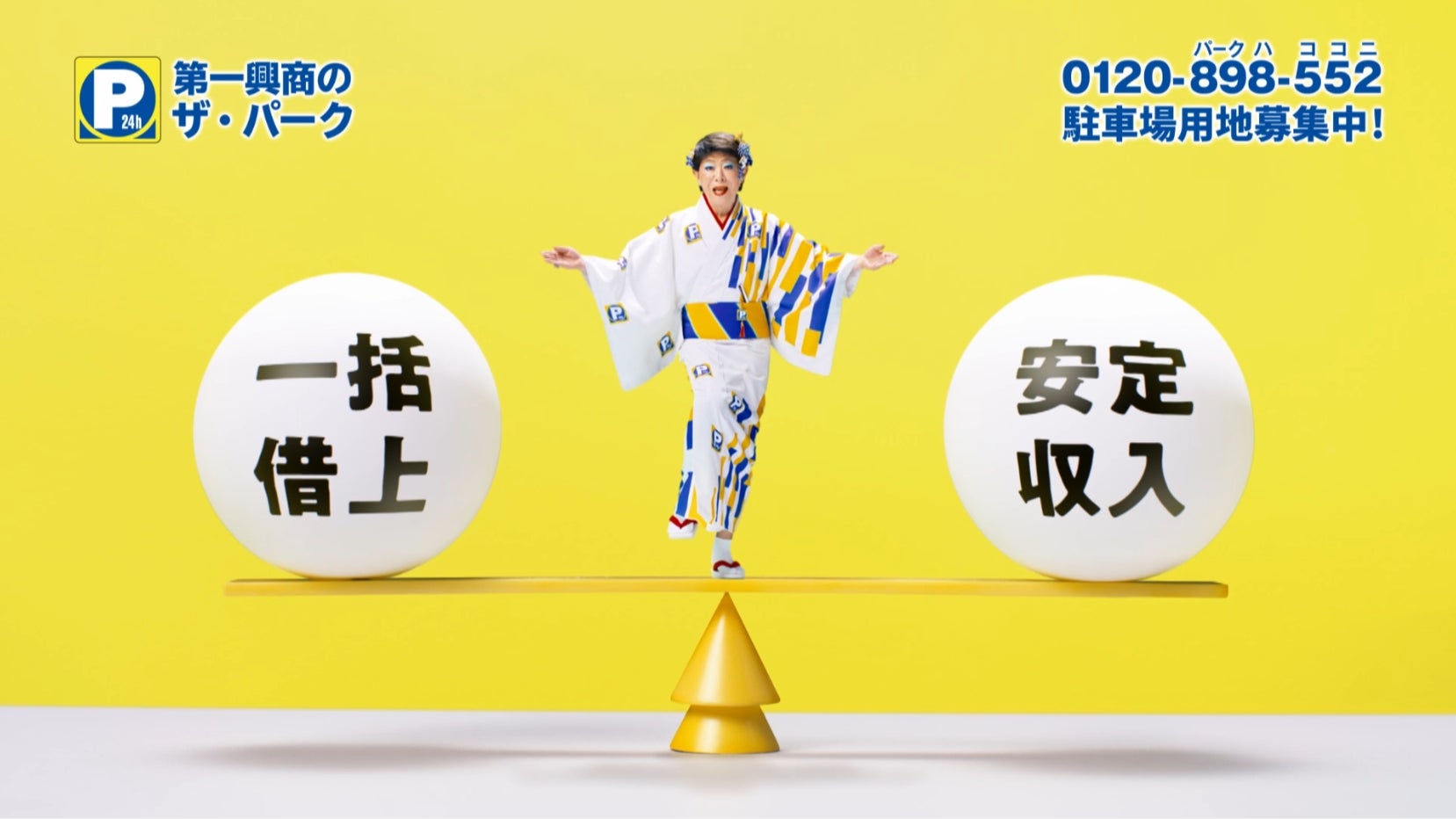 ビルの隙間やマンションの空きスペースを指差し、「ザ・パーク」での活用を提案。また、シーソーでバランスを取りながら、一括借り上げによる安定収入の魅力を表現。さらに、”管理トラブル”の文字が書いてある風船を堂々とキャッチすることで、安心して任せられるサービスであることを演出しました。