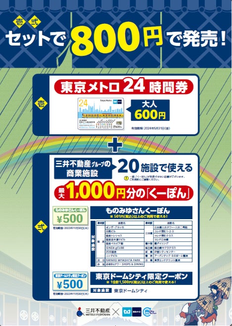 東京メトロ24時間券(600円)と三井不動産グループが運営する都内商業施設20施設でご利用いただける500円クーポン2枚の1,600円相当をセットとして、800円で発売します。