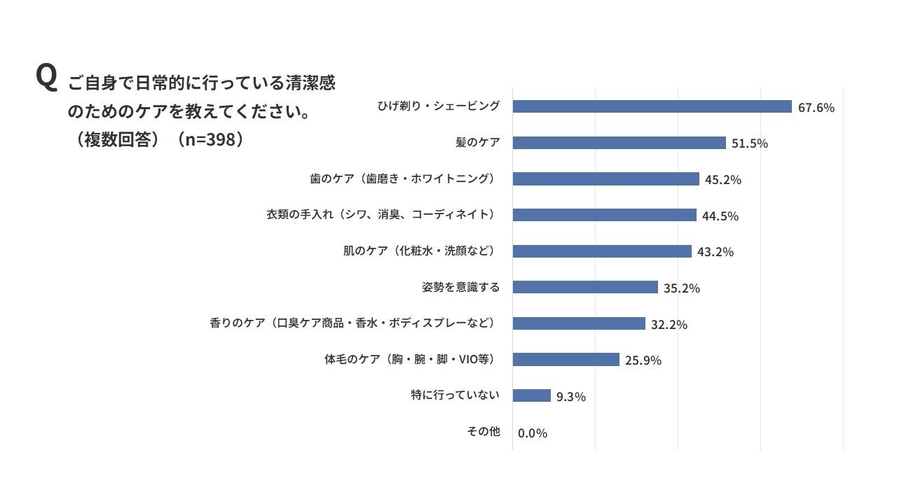 自身が日常的に行っている「清潔感のためのケア」について聞くと、「ヒゲ剃り・シェービング」が最も多く67.6%、次いで「髪のケア」が51.5%、「歯のケア(歯磨き・ホワイトニング)」が45.2%と、顔周りのケアを「清潔感」のための重要な要素として捉えている人が多いことがうかがえます。