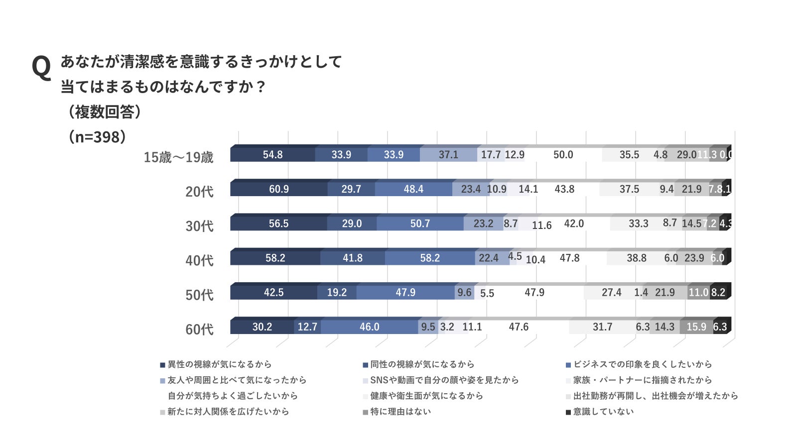 また世代別傾向として、10代は「友人や周囲と比べて気になったから」が37.1%、40代は「同性の視線が気になるから」が41.8%と、年代によって「誰に見られるか」の基準の違いが明らかになりました。